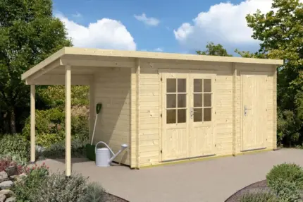 Abri de jardin Orkus-44 Petite Alpholz, 4.9×3.5m dim. ext. (cas échéant incl. débord de toit) naturel, 44mm, 17,2m² superficie totale