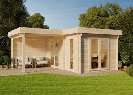 Abri de jardin à toit plat Quinta Petite ISO Alpholz, 5.8×4.8m dim. ext. (cas échéant incl. débord de toit) naturel, 44mm, 27,3m² totale