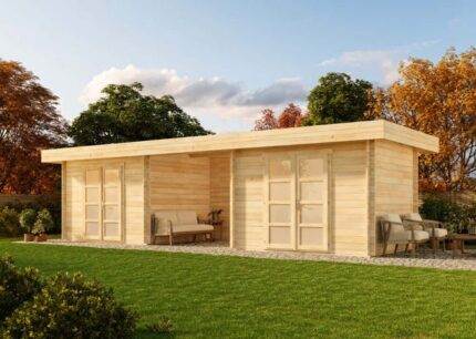 Abri de jardin Johann-28 Alpholz, 9.6×3.3m dim. ext. (cas échéant incl. débord de toit) naturel, épaisseur paroi : 28mm, 31,9m² totale