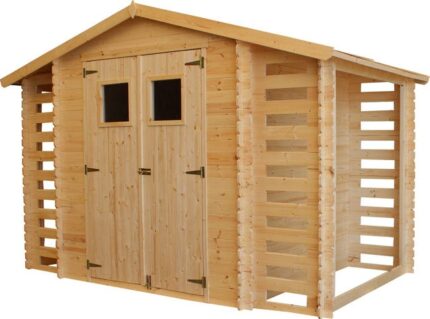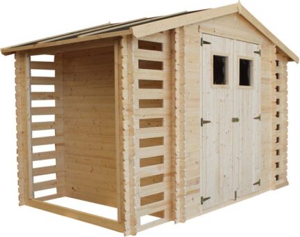 Abri de jardin en bois et range bûches extérieur AVEC SOL TRAITÉ TIMBELA M391 – extérieur I206xL328xH218 cm/ 3,53 + 0,97+0,97 m2 Petit abri à outils