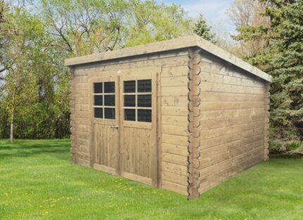 ABRI DE JARDIN bois Pin autoclave 27mm – 3,44×2,64m / 9,1m2 – Bac acier – Plancher bois