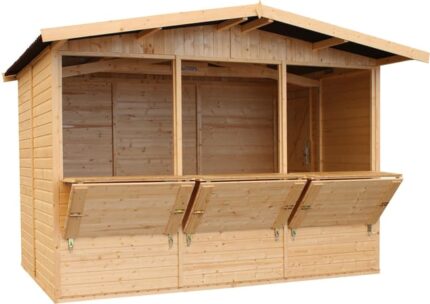 TIMBELA M150A Maison de jardin en bois, Étal de marché en bois, Grand stand de vendeur avec comptoir, TROIS FENÊTRES, H232x336x263 cm/6m2