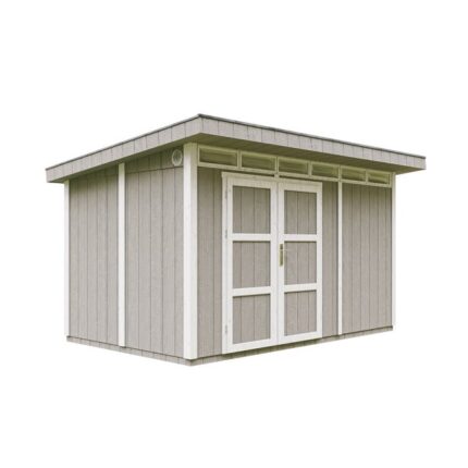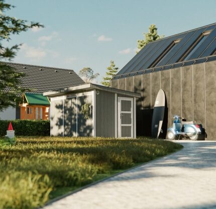 Abri de jardin à base de bois en panneaux LP SmartSide 8.52 + 2.95 m² – Garage Moto Exterieur Timbela M905C – TUNDRA GREY