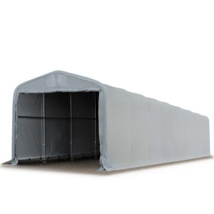 4×16 m hangar, porte 3,5×3,5 m, toile PVC de 850, gris, avec statique (type de sol : béton)