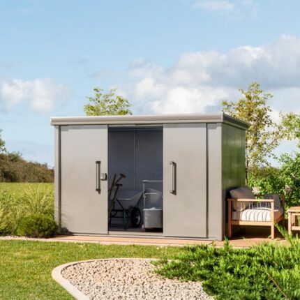 5×10 m hangar, PRIMEtex 2300, anti-feu, H. 3 m avec porte coulissante, gris, avec statique (type de sol : béton)