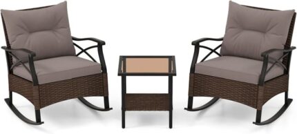 COSTWAY Ensemble de Meubles de Patio 3 Pièces, Salon de Jardin en Rotin avec 2 Chaises à Bascule et Table Basse Plateau en Verre Trempé Coussins Doux