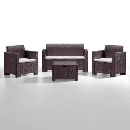 Table basse salon “Nebraska II” en résine + canapé + 2 fauteuils avec coussins marron