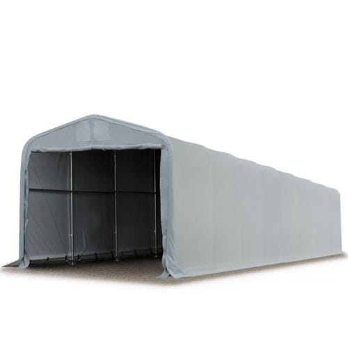 Accueil Pergola 4×24 m hangar, porte 3,5×3,5 m, toile PVC de 850, gris, sans statique