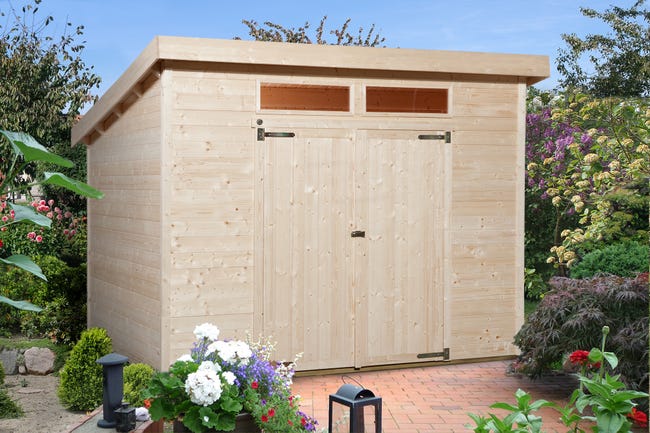 Abri de Jardin avec sous-construction résistante aux intempéries et Porte Double Large en Bois Massif. Toit en Appentis, Grandes Impostes