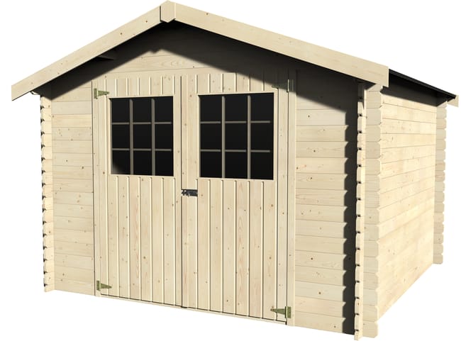 Abri en madriers de 28mm à emboîter, porte double vitrée.. Dimensions au sol L.298 x P.298cm / surface utile 7,42m²