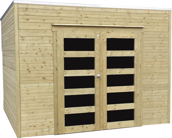 Abri de jardin en panneaux de 19 mm traités en autcolave classe 3 , double porte battante vitrées avec serrure inox à clés , barre de seuil en aluminium de 2 cm pour un accès facile, grilles de ventilation , toiture en planchettes de 16 mm avec membrane EPDM