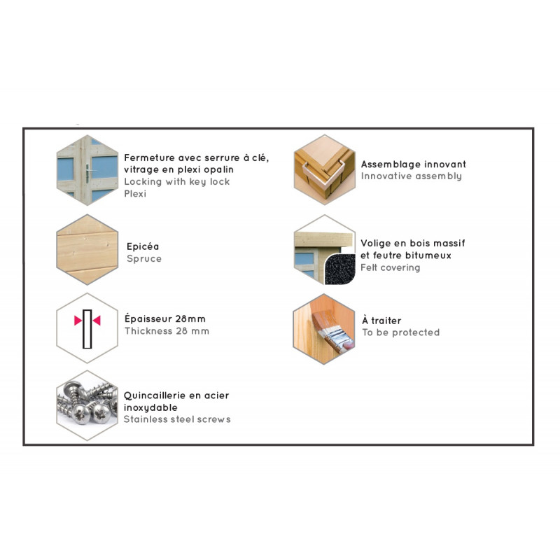 L’abri de jardin 17,46m² Lounj est réalisé en épicéa massif issu des forêts gérées d’une manière responsable. Écologiques et épais de 28mm, les madriers s’emboîtent parfaitement à l’aide d’un assemblage innovant. Livré brut, le bois demande un traitement avant le montage. Vous pouvez appliquer une couche de lasure ou une peinture au choix, si vous souhaitez personnaliser votre abri de jardin Forest Style.