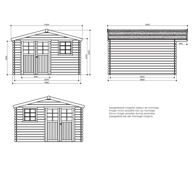 Les madriers profilés Windblock s’assemblent précisément entre eux par rainures et languettes finement usinées qui confèrent aux parois des propriétés hydrofuges et coupe-vent. Une bouche de ventilation en acier inoxydable assurera une bonne circulation de l’air dans l’abri, évitant tout risque de moisissures. Les parois ont une hauteur de 191cm et la toiture à double pente une hauteur faîtière de 253cm. La toiture est composée de planchettes de 16mm d’épaisseur, et résiste à une charge de neige maximale de 75kg/m².