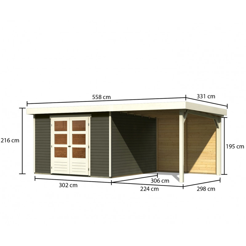 Abri de jardin en bois massif gris terre 9,24m² Askola 6 avec appentis 240cm et paroi arrière – Karibu
