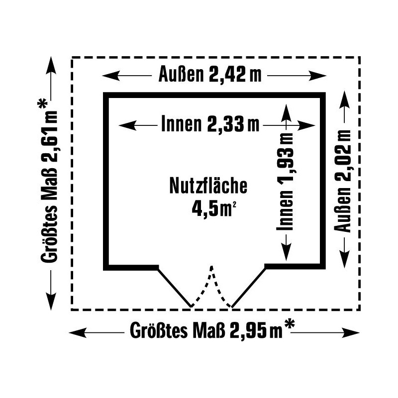 . Dimensions extérieures hors tout (lxP) :  295x261cm, soit 7,7m²,