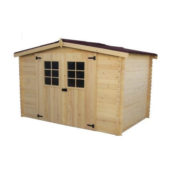 Abri AL3019.02NJ madriers 20mm surface 5,83m2 avec joint d’étanchéitéAvantages :- Abri avec une grande façade de 3 m- Excellent rapport qualité / prix pour un abri en madriers- Livré avec toit en plaques ondulées     pour une plus grande longévité- Porte avec fenêtre intégrée- Produit fabriqué en EUROPE- Produit FSC- Fourni avec un joint d’étanchéité pour éviter les infiltrations d’eau par le solCaractéristiques techniques :Matière : Epicéa massif non traitéParois : Madriers avec rainure languette en sapin épaisseur 20 mm. Coupe chalet pour un assemblage des parois en angle solide et étanche. Coupe biseautée en bout de lames.Couverture : Plaques ondulées bitumées de couleurCouleur : Bois naturel – Pentures bi-chromatéesConseil entretien : A lasurer intérieur et extérieur immédiatement après montagePlancher : Sans plancherCertification : FSCTraité : Non traitéGarantie : 4 ans pour le bois (voir conditions d’entretien / garantie)Recommandation d’utilisation : Usage domestique pour rangement tous produits non dangereuxDimensions hors-tout : 310 x 188 cmDimensions intérieures : 280 x 164 cmSol : 300 x 184 cmHauteur faitage : 197 cmHauteur paroi : 171 cmAvancée toit : AV 78 mm / AR 78 mmPorte : Simple avec lucarne dimensions 1,60 x 1,69 mSurface utile : 4,59 m2Surface extérieure : 5,83 m2Dimension du colis (L x P x H) : 200 x 120 x 42 cmPoids du colis : 211 kgConseils de mise en service :- A installer sur une dalle béton obligatoirement- Dimensions 2835 x 1675 mm, diagonale 3293 mm- Pas plus de 10 mm de défauts.