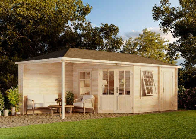 Abri de jardin pentagonal Rhein-40 avec extension Alpholz, 7.3×3.2m dim. ext. (cas échéant incl. débord de toit) naturel, 40mm, 23,6m² totale
