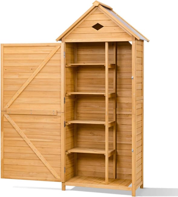 • Votre jardin a-t-il beaucoup d’outils dans un coin ? Craignez-vous que vos outils n’aient pas de place pour les mettre ? Cet abri de jardin est un bon choix pour vous aider à stocker les outils, avec 5 étagères et un grand espace, vous pouvez y placer des outils de jardin différents. Fait en sapin, cet abri de jardin n’est pas facile à moisir et il a une longue durée de vie.