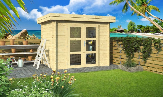 En madriers d’épicéa de 34mm, l’abri de jardin LYON 5 se veut solide et durable. Son design est à la fois élégant et moderne de par son toit plat. Sa surface de moins de 5m2 ne requiert pas de démarches administratives. Sa double porte vitrée vous permettra d’y ranger du matériel volumineux de façon aisée. Pensez à lui offrir la protection qu’il mérite : toiture définitive, traitement et lasure de qualité.Détails de livraison :
