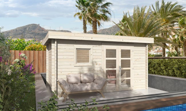L’abri de jardin Marseille 9 offre une esthétique moderne avec ses madriers en épicéa de 44 mm et son toit plat. Sa surface utile de 8.80 m2, ses menuiseries en double vitrage et sa double porte de 141x182cm le rendent fonctionnel et élégant. Livré en bois brut, un entretien (traitement et lasure) est recommandé pour assurer sa durabilité. Le revêtement de toiture en feutre bitumeux fourni est temporaire et nécessite d’être renforcé par une solution définitive.Détails de livraison :