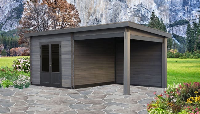 L’abri de jardin avec auvent Skala en bois composite propose une surface utile de plus de 15 m2, dont 7.92 m2 de surface fermée, le tout avec un toit monopente. Pourvu d’une double porte semi-vitrée en aluminium, dotée d’une serrure à cylindre européen pour remiser vos biens en toute sécurité, cet abri mêle praticité et élégance. Il est livré sans revêtement de toiture.Détails de livraison :