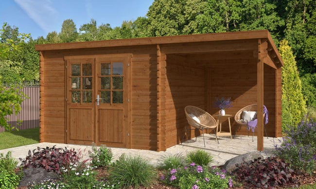 En madriers de 34 mm, l’abri de jardin TAMPA AUTOCLAVE propose à la fois un beau volume et un très bon rapport qualité-prix. Sa surface intérieure de 8,13m2 se prête au rangement de votre mobilier de jardin ou de votre barbecue, et elle est complétée par une extension couverte de 5,45m2 idéale pour stocker vos vélos ou votre remorque. Cet abri à toit plat élégant et très polyvalent ne nécessite qu’un entretien réduit de par son traitement réalisé en usine, et offre des équipements de qualité : lames anti-tempêtes, large double porte semi-vitrée … Il n’attend que vous ! Optez pour une toiture définitive afin d’assurer sa bonne durabilité.Détails de livraison :