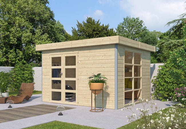 Conçu avec soin, ce petit abri de jardin est composé de madriers en bois brut de 28mm d’épaisseur et d’un toit métallique. Il présente, une ligne épurée avec d’élégants profils de coin en aluminium, pour parfaire son étanchéité.