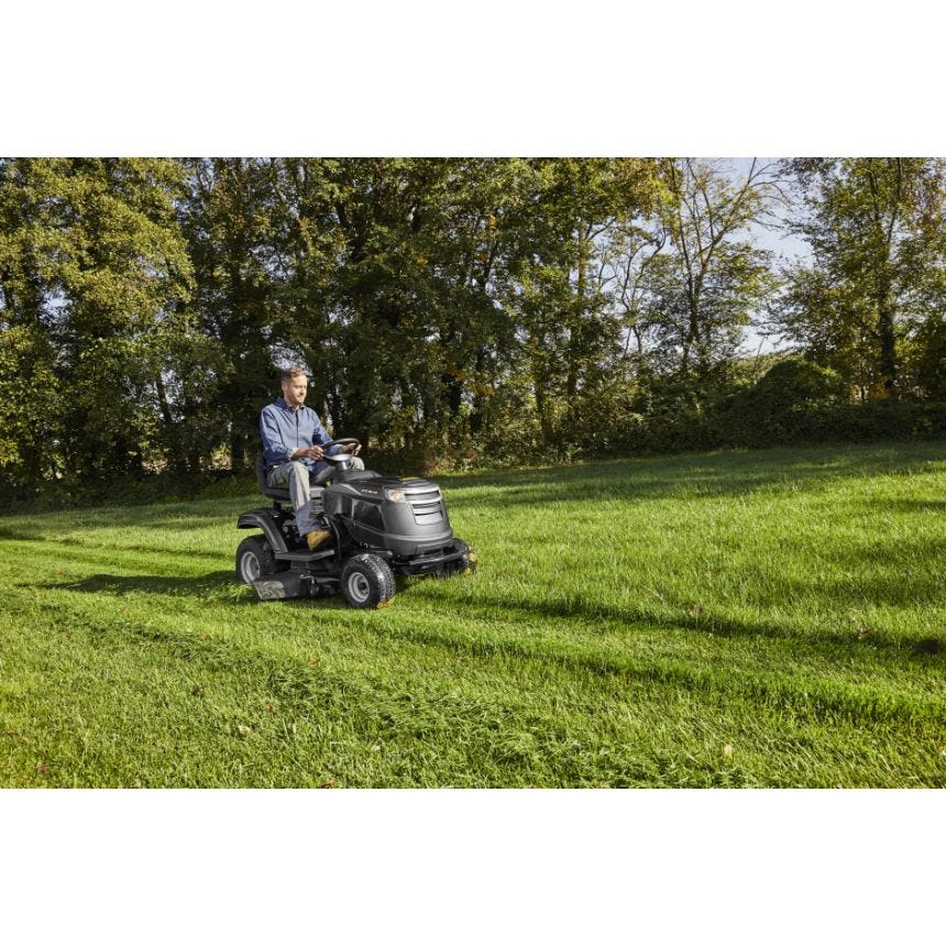 Cette autoportée de 98 cm de coupe peut éjecter latéralement ou faire du mulching et dispose d’un entraînement hydrostatique à pédale. La puissance provient d’un moteur 414cc STIGA. Kit mulching disponible séparément.