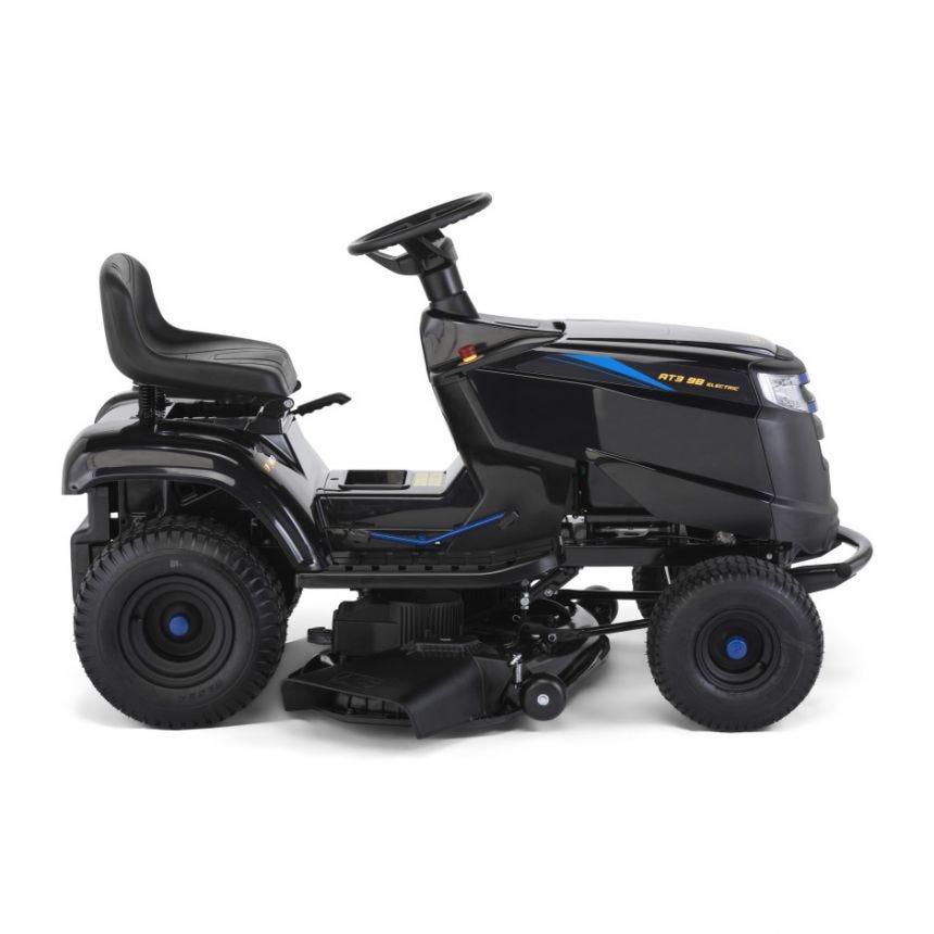 Un tracteur de jardin électrique à éjection latérale de 48 V alimenté par batterie Li-ion et offrant une largeur de coupe de 98 cm. Idéal pour des parcelles de l’ordre de 3500 m².