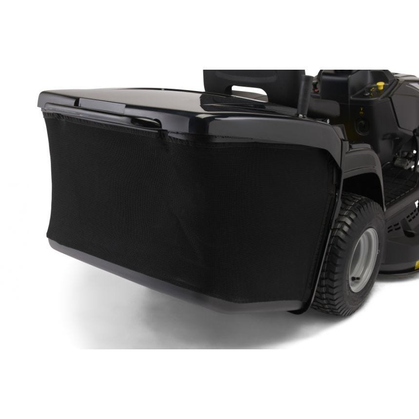 Un entraînement hydrostatique – contrôlé via une pédale – optimise le contrôle et la maniabilité ; Une série de roues de jauge sert à éviter les dommages sur le gazon en empêchant les bords du plateau de coupe de 98 cm de marquer le sol.