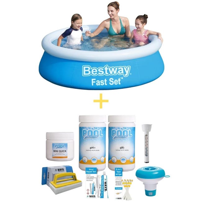 Le kit d’entretien de piscine WAYS Small a été spécialement conçu pour entretenir au mieux votre piscine. Le kit Small est adapté aux piscines et jacuzzis ayant une contenance en eau entre 0 et 2500 litres. Ce kit contient des tablettes de chlore de 2,7 grammes conçues pour des piscines de la capacité indiquée ci-dessus. Si vous utilisez le diffuseur de chlore flottant fourni, le chlore sera réparti de façon égale dans l’eau de piscine. Ensuite, le kit contient du pH+ et du pH- pour maintenir le taux de pH dans les bonnes normes. La bonne valeur de chlore et de pH peut être vérifiée grâce aux bandelettes de test WAYS fournies. Ce kit contient également un kit de réparation WAYS, simple à utiliser lorsque la piscine présente une petite fissure ou un petit trou. Enfin, la brosse à récurer WAYS vous aide à nettoyer les rebords de la piscine, et le thermomètre Intex vous indique la température exacte de l’eau de piscine. En conclusion, un kit d’entretien complet pour tout l’été !