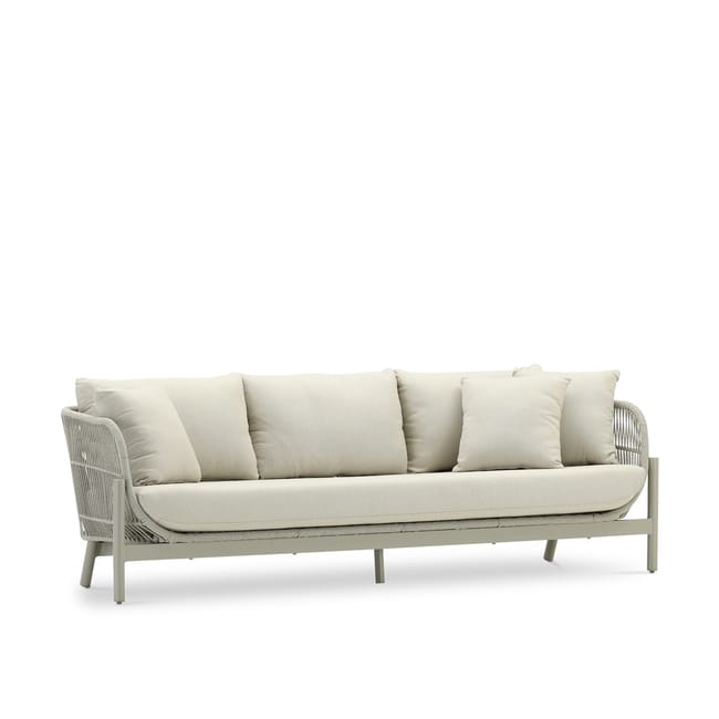 La collection Milos se distingue par la simplicité de ses formes et de ses lignes courbes. Dans des tons neutres et élégants, la combinaison des matériaux, tissu, aluminium et corde, s’harmonise dans tous les espaces. Canapé 3 places en aluminium beige Corde beige tressée à la main Coussins déhoussables beige Dimensions : 231x78x68cm.