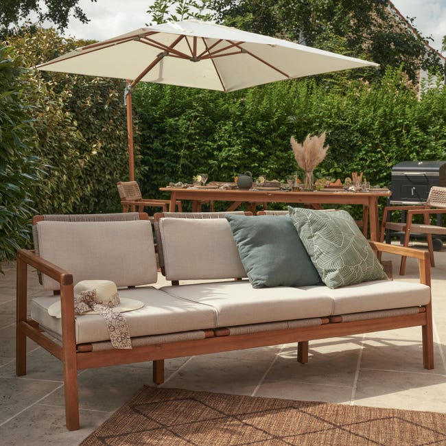 Doux mélange entre une structure en acacia et une assise en cordage, le sofa 3 places Oasis offre un confort optimal pour vos apéritifs en extérieur. Fabriqué en acacia, ce sofa apportera de la chaleur à votre terrasse. Utilisable avec ou sans son coussin (inclus), il conviendra à toutes vos activités. Qualifié pour l’usage professionnel, il peut également être utilisé en terrasse d’hôtel privé.
