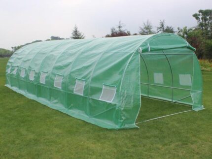 Serre tunnel 18m² avec fenêtres latérales et large porte enroulable – Bâche renforcée et structure Ø25mm