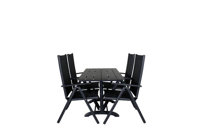 Salon de jardin Denver table 70x120cm et 4 chaises Break noir est une table de jardin de couleur Noir qui apporte à la fois style et fonctionnalité à votre intérieur. Salon de jardin Denver table 70x120cm et 4 chaises Break noir. Incl. plaques supplémentaires : Non. Longueur de la table sans plaques supplémentaires : cm. Longueur de la table avec plaques supplémentaires : cm. Table : L 70 x H 74 x L 120 cm. Chaise : L 55 x H 107,5 x P 62 cm. Hauteur d’assise : 44 cm. Profondeur d’assise : 43 cm. Largeur d’assise : 45 cm. Hauteur des accoudoirs : 66,5 cm. Poids maximum de la chaise : 110 kg. Coussins : Non. Chaise empilable : Non. Chaise réglable : Oui. Ce produit est créé avec un souci du détail, ce qui garantit à la fois un attrait esthétique et une grande durabilité. Il est conçu dans un souci à la fois de fonctionnalité et de style, ce qui en fait le choix parfait pour n’importe quelle pièce de votre maison. Les matériaux utilisés sont de haute qualité, ce qui confère au produit une longue durée de vie et lui permet de résister à une utilisation quotidienne. Que ce soit pour le rangement ou comme ajout décoratif, ce produit rehaussera votre décor et apportera plus de confort et d’élégance à votre maison.