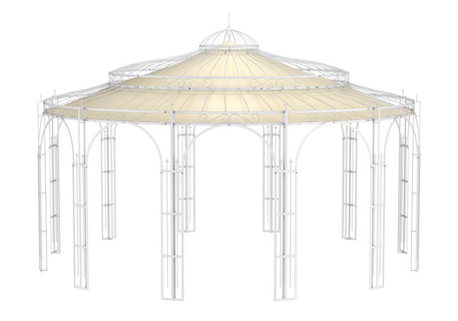 Sous le toit de notre tonnelle ronde en métal « Toscana », vous jouirez d’un très grand espace pour accueillir de nombreux invités. Si la tonnelle s’étend sur plus de cinq mètres, elle n’en reste pas moins extrêmement raffinée. Conçue en fer forgé massif qui lui confère une qualité exceptionnelle et une stabilité optimale, elle sublimera votre jardin pendant de longues années. Nous vous proposons une large sélection d’accessoires disponibles séparément. Vous pourrez ainsi la doter, par exemple, d’une voile d’ombrage en tissu qui vous offrira un coin d’ombre agréable. Vous pourrez également orner les montants de vignes ou de roses grimpantes de manière à créer un îlot verdoyant qui agrémentera à merveille votre jardin. Vous profiterez de longues années durant de ce pavillon haut de gamme qui créera une oasis de bien-être dans votre jardin.