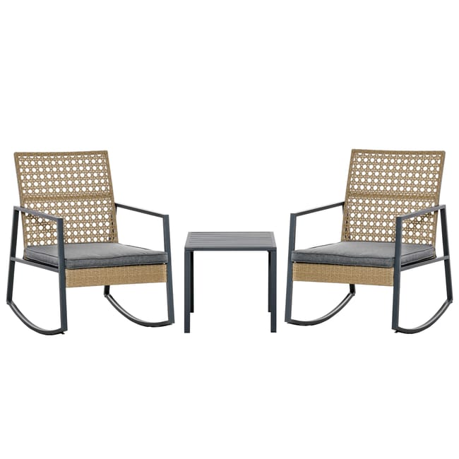 – Ensemble de jardin 2 personnes composé de 2 fauteuils à bascule et d’une table basse carrée en métal époxy anticorrosion avec plateau à lattes