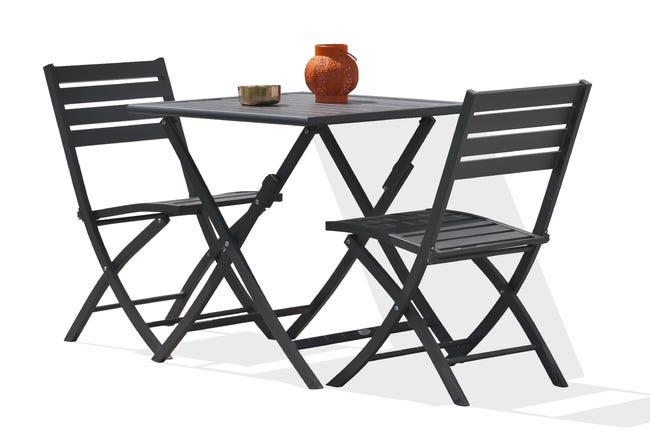 Ensemble repas de jardin en aluminium gris anthracite composé d’un guéridon de jardin pliant et de 2 chaises de jardin pliantes. DIMENSIONS Table : L 70 x l 70 x H 73 cm Table pliée : L 70 x l 20 x H 100 cm Chaise : L 46 x l 41 x H 82 cm Hauteur d’assise : 43 cm Chaise pliée : l 46 x H 96 cm