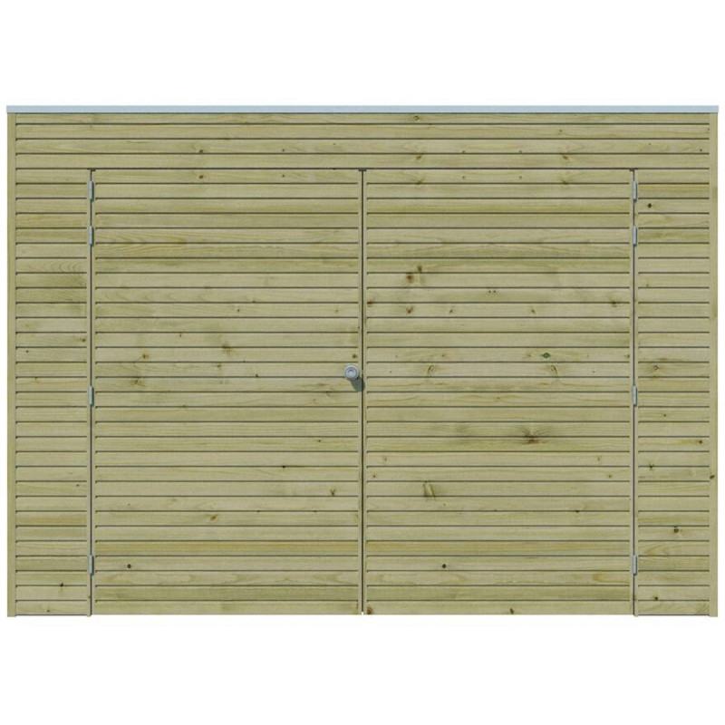 Le garage en bois Gardenas est équipé d’une porte double avec une serrure à boule inox avec cylindre intégré. Les dimensions de la porte sont de 2x114x189cm, avec une ouverture libre de 227x188cm. De plus, une fenêtre haute est fournie, avec un vitrage en plexiglass transparent et une ouverture libre de 215×34,5cm.