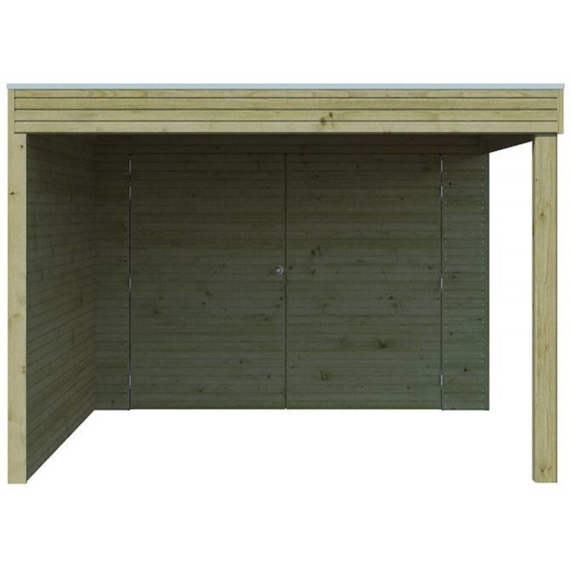 Garage Qube 15,3m² + extension 300cm en bois traité autoclave madriers 27mm avec double porte battante + fenêtre – Gardenas