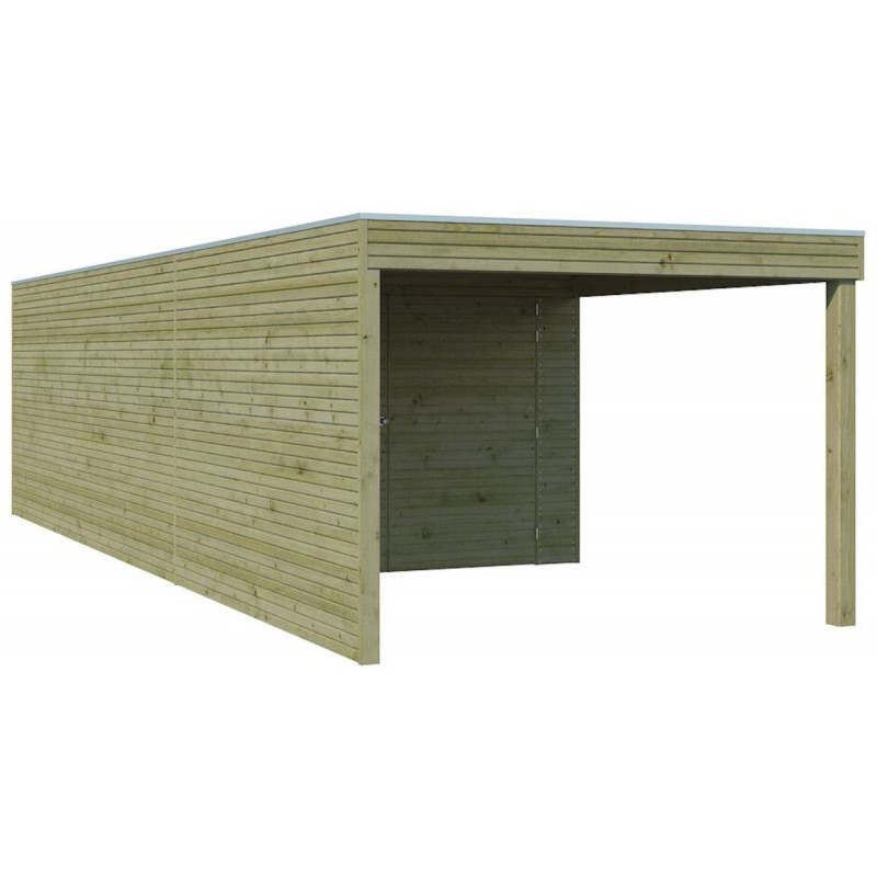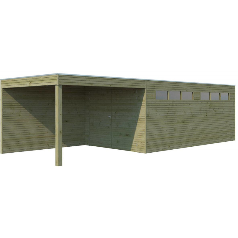 Garage Qube 15,3m² + extension 600cm en bois traité autoclave madriers 27mm avec double porte battante + fenêtre – Gardenas