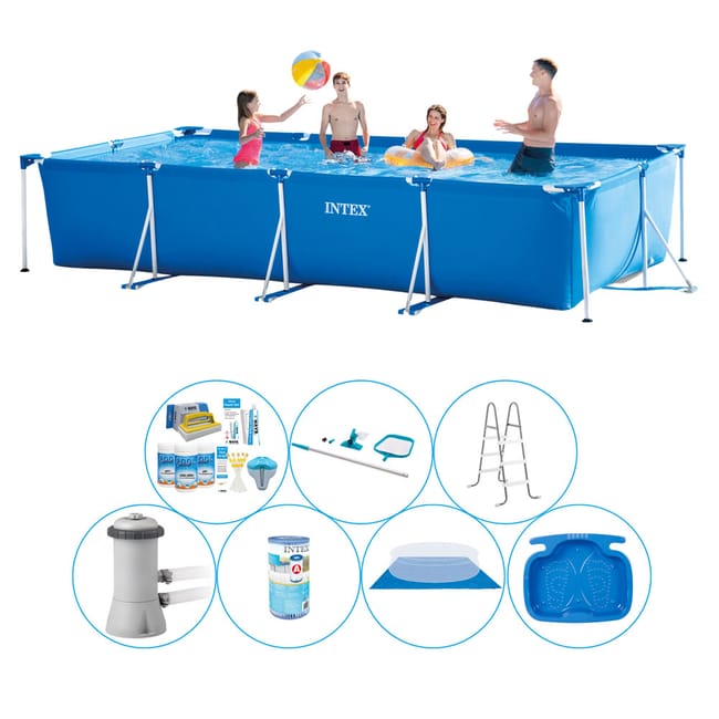 Pendant un été torride, rien de mieux que de se rafraîchir dans sa propre piscine. Grâce à la haute qualité d’Intex, vous obtenez une solution pour de nombreuses années à venir ! Cette piscine rectangulaire d’une taille de 450x220x84 cm offre un espace pour 8 personnes et est prête à nager en 30 minutes. La piscine a une construction robuste grâce au cadre en métal et au liner épais à 3 couches. La couche intérieure est en polyester et donc adaptée aux enfants.Avec cet ensemble, vous avez en une fois tout ce dont vous avez besoin pour un entretien optimal de votre piscine.