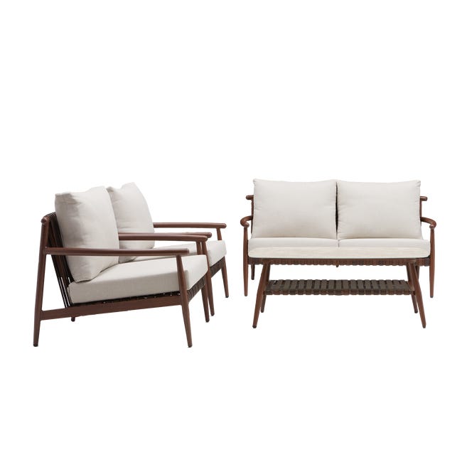 “Apportez un design et un confort unique à votre extérieur avec le salon de jardin Retro Partagez un thé glacé lové dans votre salon tendance et confortable Le salon de jardin Retro est pensé pour accueillir confortablement 4 personnes, et se compose d’un canapé 2 places, de 2 fauteuils et une table basse. Conçu en aluminium effet bois et en cuir synthétique, cet ensemble offre une esthétique unique sans les contraintes d’entretien du bois. Ses coussins, moelleux et déperlants, se fixent à la structure pour vous permettre de profiter confortablement du moindre rayon de soleil, et cela saison après saison. Sa table, avec sa structure en aluminium effet bois et son plateau en verre émaillé, est naturellement résistante à la pluie, au froid, et ne craint pas les moisissures. Une surface de rangement en lamelles de cuir synthétique, disponible sous le plateau, permet de garder vos livres ou accessoires à proximité. Le renouveau du style rétro La gamme Retro, pensée pour répondre au style vintage du milieu du 20ème sièce, combine un design unique et des matériaux résistants permettant d’adapter ce style d’intérieur à votre terrasse. Cet ensemble authentique et harmonieux se mariera à la perfection avec une terrasse verdoyante. L’ensemble table et chaise de la gamme Retro est également disponible, reprenant les mêmes codes de style pour une terrasse complète. Des matériaux simples d’entretien Conçu pour durer, le mobilier de la gamme Retro nécessite peu d’entretien. Au quotidien, un chiffon humide et un produit neutre suffisent à son entretien. Afin de préserver votre mobilier, il est préconisé de stocker les coussins à l’abri de l’humidité lors des périodes d’inutilisation. Réparable, des pièces détachées sont disponibles pour prolonger la durée de vie de votre mobilier. “