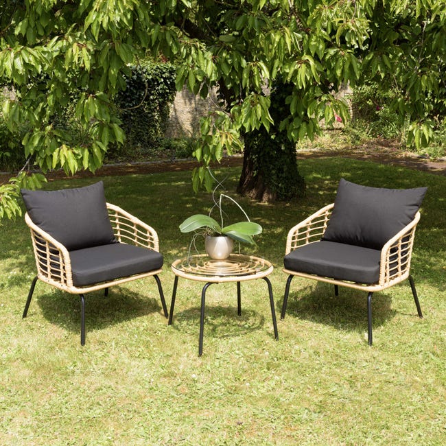 MALO – Ensemble de 2 fauteuils rotin synthétique et table basse ronde