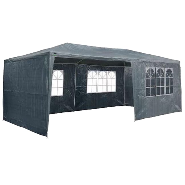 Les parois latérales avec 18 fenêtres cintrées peuvent être enroulées si nécessaire. Le pavillon est équipé de 6 pieds ancrés et d’une construction métallique.