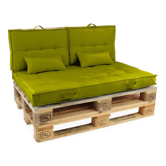 Adepte du fait-maison, réalisez votre propre banquette/canapé de jardin avec ce pack palettes et coussinage top qualité ! L’ensemble CUZCO est composé de palettes de bois EPAL (11 planches de bois de qualité et 9 dés en bois aggloméré supportant une charge de 1500 kg) et de ses coussins aux dimensions parfaites pour se créer un coin détente et convivial en un tour de main. Prenez place dans votre espace farniente… Disponible en 6 coloris au choix (gris, vert, taupe, bleu, jaune, écru), l’ensemble de coussins entièrement déhoussables (pratique !) se compose de deux coussins dossier (dim : 60 x 40 x 12/8 cm) et d’un coussin d’assise (120 x 80 x 12 cm). Fabriqué avec un tissu 100% polyester très résistant, il vous promet un accueil confortable au jardin grâce à son rembourrage de qualité (1 couche centrale de mousse 210g/m² et 2 épaisseurs de mousse de 600g/m²). Notez que les palettes (Dim : longueur 120 cm x profondeur 80 cm x hauteur 15 cm) ne sont pas assemblées pour vous permettre de les installer comme bon vous semble ! Poids : 50 kg