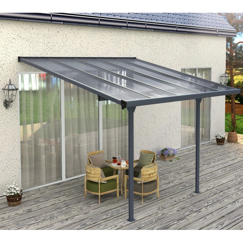 . Toit translucide et anti-UV, composé de panneaux de polycarbonate double alvéolaire traité anti-UV, épais de 6mm, de couleur grise