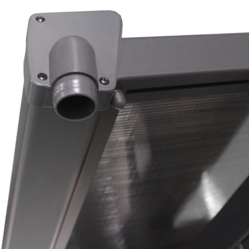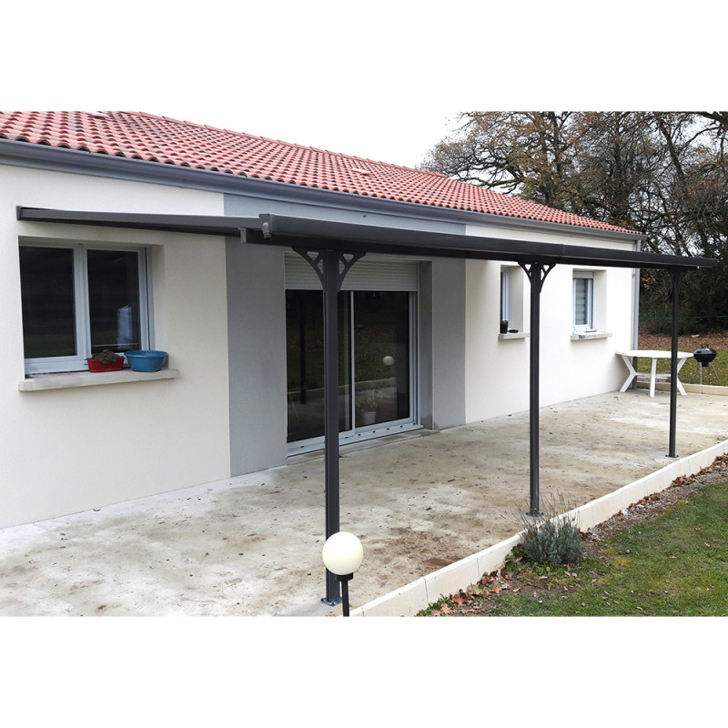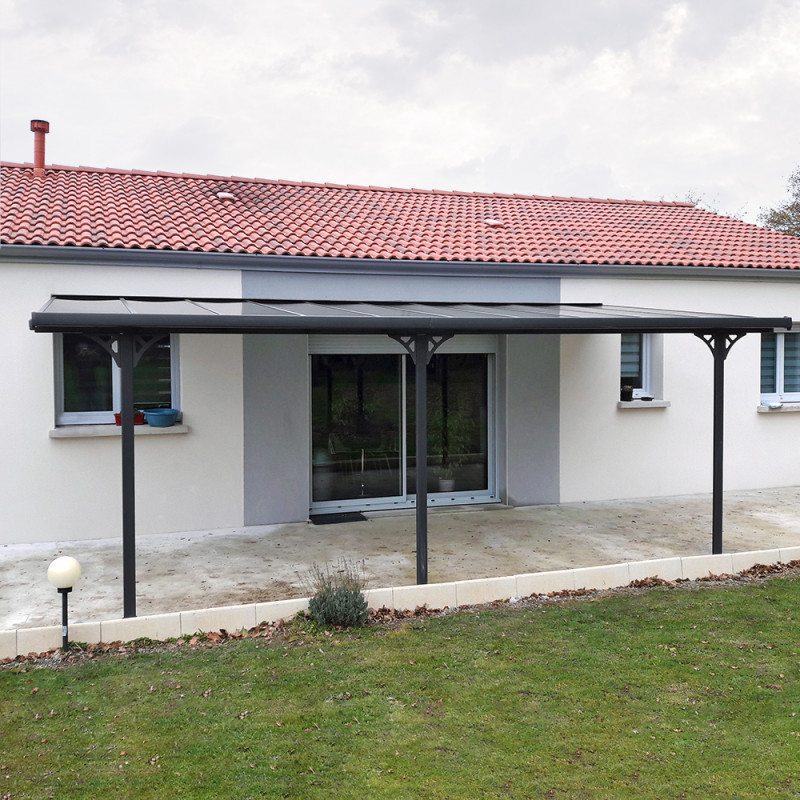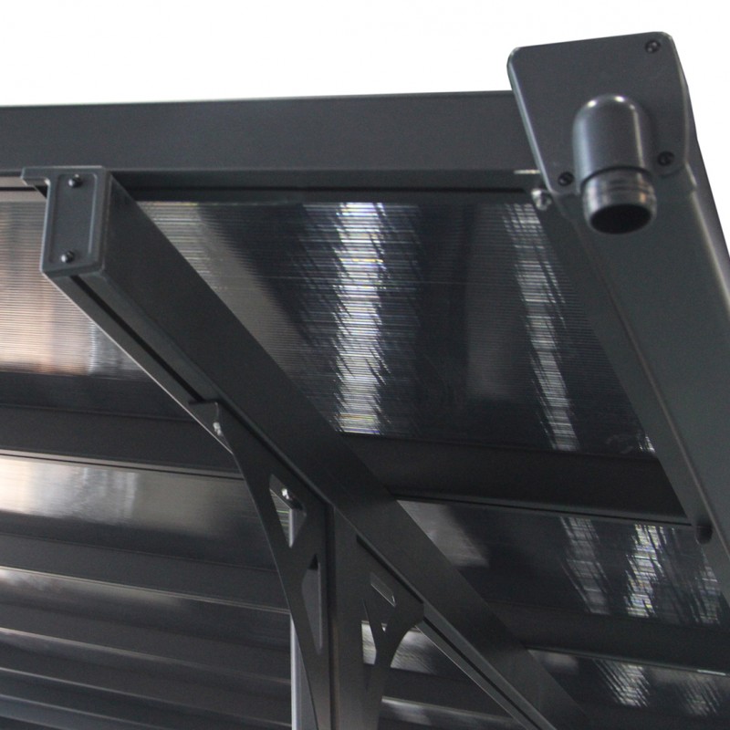 Réalisée en aluminium, anti-corrosio, recouvert d’une peinture qualitative multi-couches de couleur anthracite, pour un aspect moderne, cette pergola adossée est couverte de panneaux épais de 6mm en polycarbonate fumés gris pour un accord parfait et pour filtrer plus efficacement les rayons du soleil.