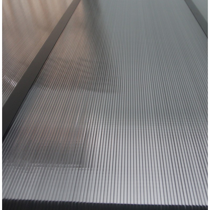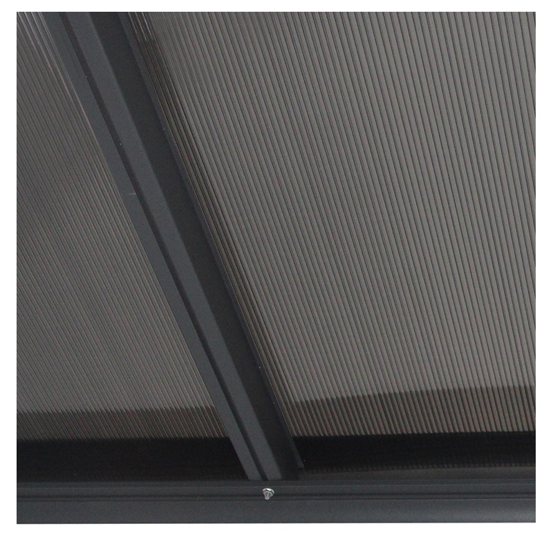 . Toit translucide et anti-UV, composé de panneaux de polycarbonate double alvéolaire traité anti-UV, épais de 6mm, de couleur grise
