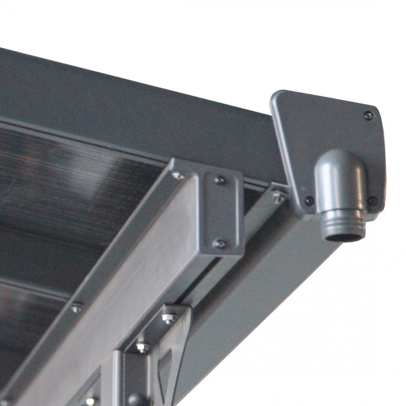 Afin d’éviter les désagrément liés au ruissellement des eaux de pluie, le profilé avant dispose d’une gouttière intégrée ejectant l’eau aux extrémités du toit. Des descentes d’eau de pluie peuvent être connectées afin de les orienter dans un réservoir par exemple.
